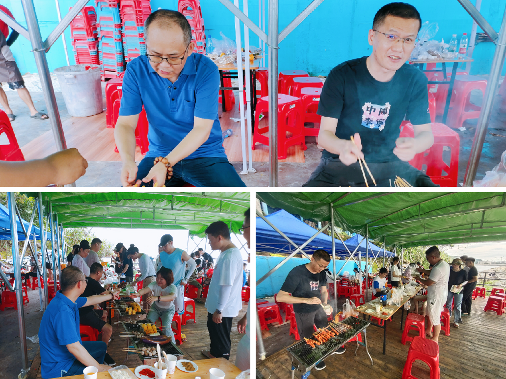 一線海景燒烤,各式各樣的烤串、幾杯啤酒、飲料,還有各種放松的娛樂項目。全員齊動,自給自足,推杯換盞,把酒言歡,其樂融融,好不愜意